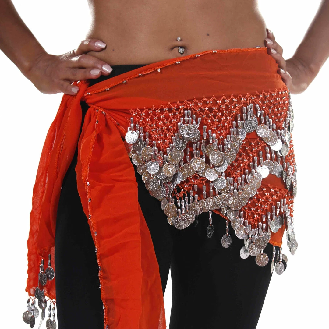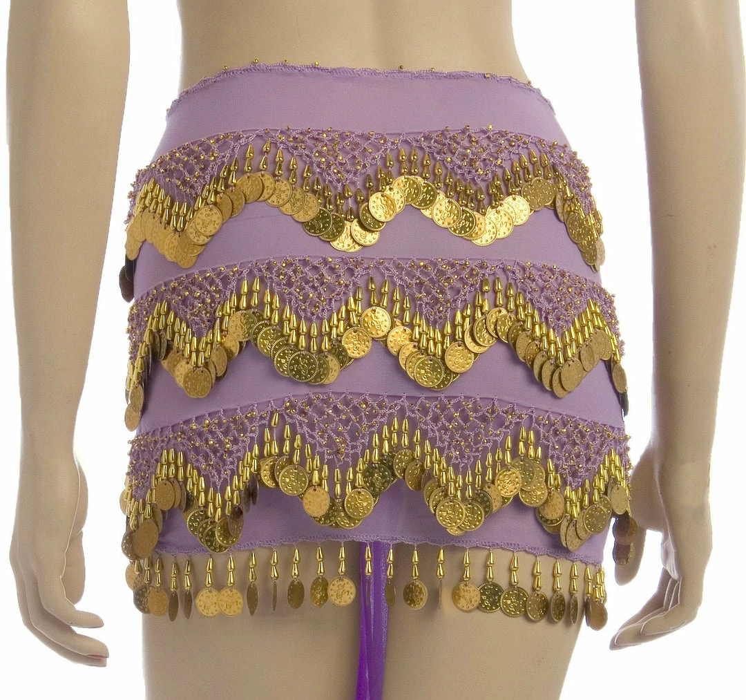 KC -Winding Winds…This very cute cut is rectangular and wraps around the body showcasing the coins on the side. Perfect for routines emphasizing lots of hip drops. The fabric is chiffon with a crocheted pattern adorned with beads and coins. Ties to the side so it doesn’t slip off with ease.