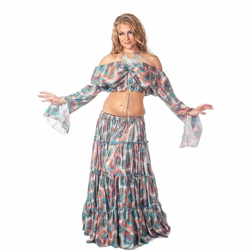 CS126C-Irabandar…What a gorgeous print you get with this 25yard skirt ensemble. Sleeves flare at wrists and skirt spins out full like a peacock’s feathers, its really something to behold. The top has elastic at shoulders with a drawstring bodice center. The skirt has elastic and fits multiple sizes. This ensemble looks great on troupes and works well for festivals and shows.