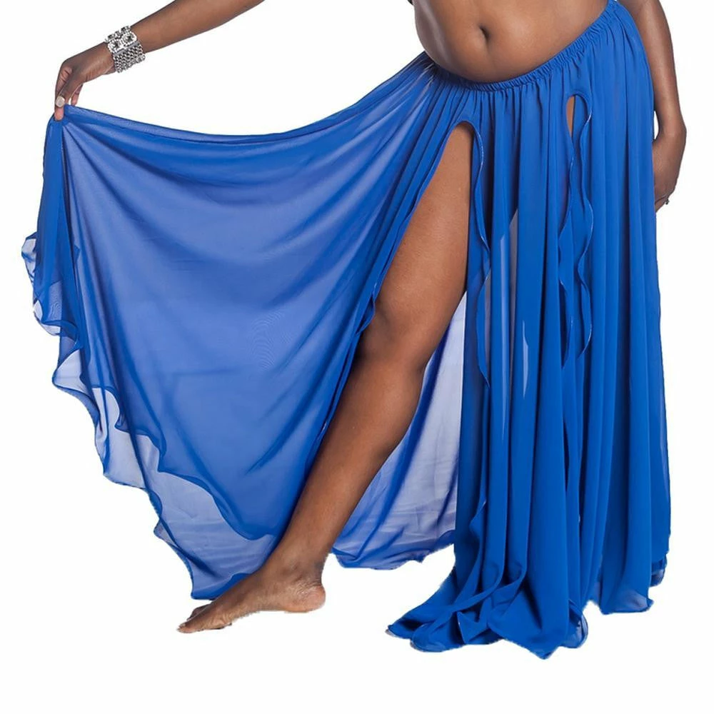SKC109- CHIC CHIFFON TWO …Our dual slit skirt has an elastic waist and is parallel to our Chic Chiffon but with two splits. This skirt is designed for the splits to show off a little extra leg right up to the upper thigh. The effect is quite artistic and best for dancers who are skilled at working with skirts in this fashion. You can also double up this skirt by layering it on top of another for a luxurious dance presentation in both modern dance and raqs sharqi (belly dance). The skirt has elastic in the waist and scalloped edges.