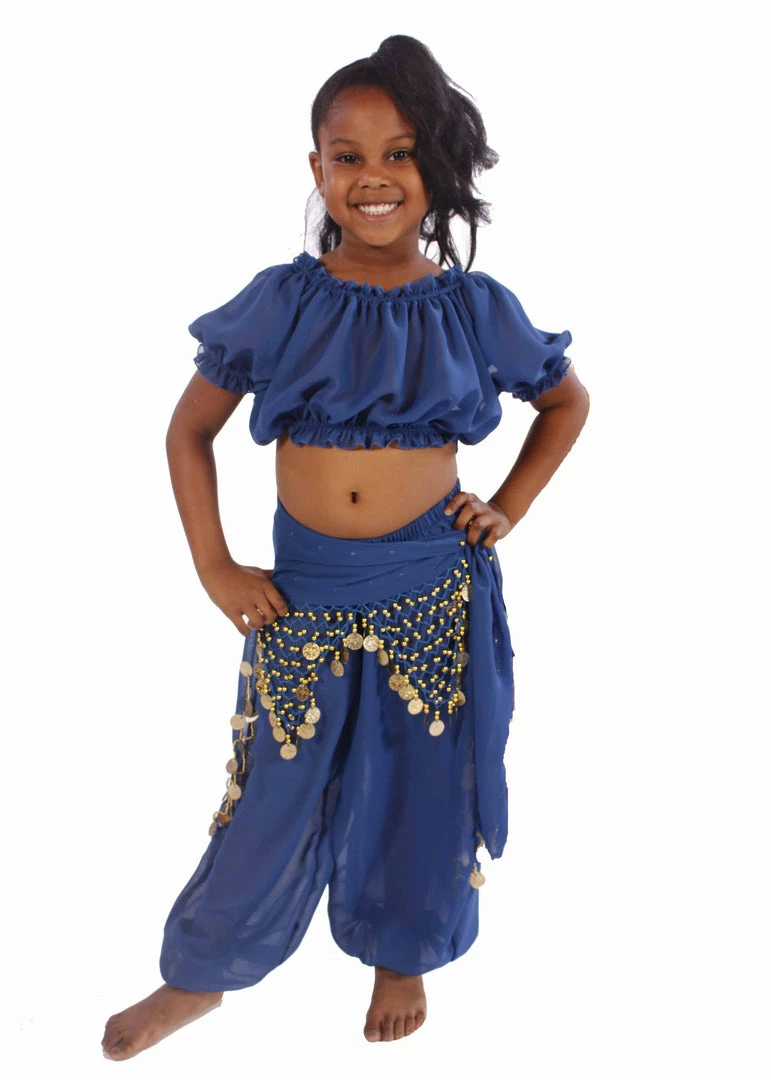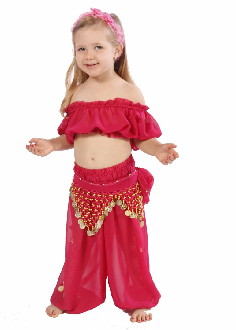 CS228-Belly Babies…Your daughter will have a blast in this fun pint size 3-piece. Top has elastic in the sleeves and mid-drift. Pants are roomy and comfy and come with a coined hip scarf that makes noise as she runs about.