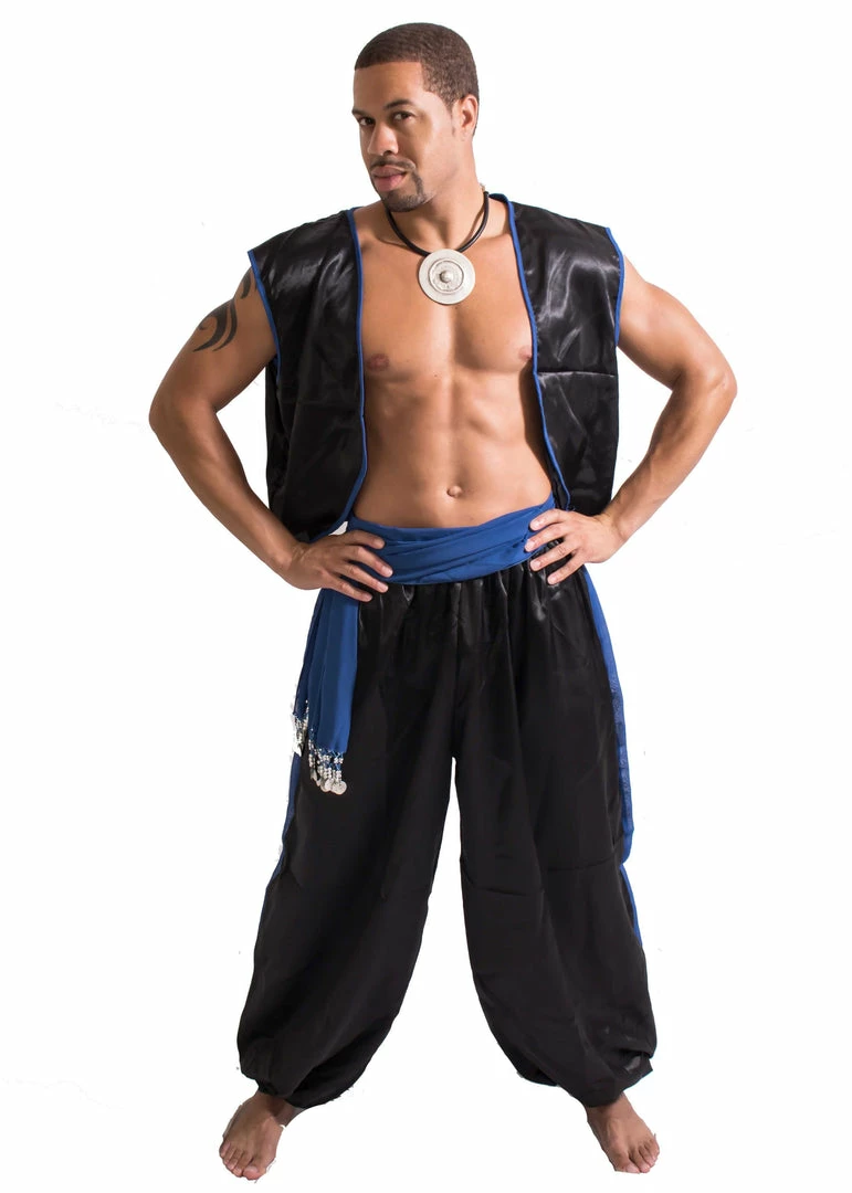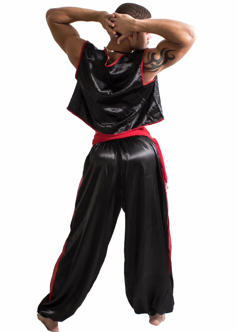CS386- Magnificent Man…Men dance! Put your guys from the studio in this sensational three-piece men’s raqs ensemble. It features an open vest with trim, dance pantaloons and a matching men’s style hip sash. He’ll be handsome with every hip drop.