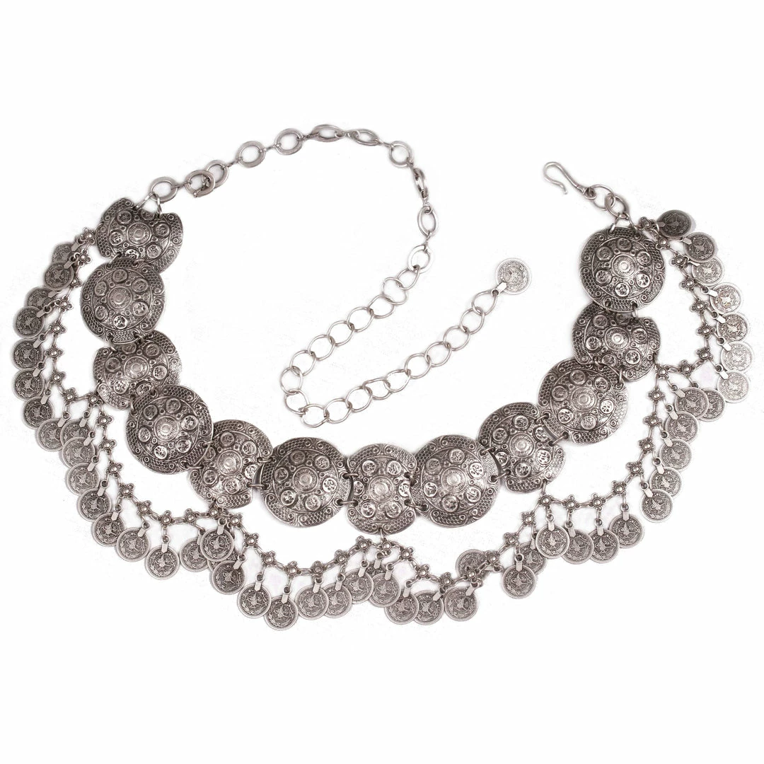 804-Caravan… This Unique Belt was designed centuries ago. It has been fashionable ever since women and jewelry exist. Stunning Handmade beautifully designed Silver tone Anti-tarnished Belly Dance Belt makes a lovely sound with every move This elegant belt will bring an exotic touch to your look. It can be worn as a belly dance accessory while dancing or decorates your night dress and enhances your opulence