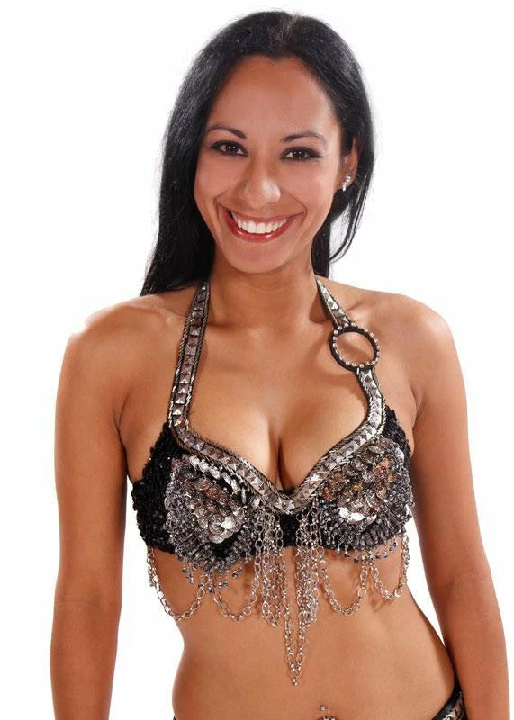 TBR22-Raqs n’ Rock Bra…This is the matching bra top to our Raqs n’ Rock belt, the tribute to Jenny ‘Lady J’ a gifted and talented raissa with a presence so fantastic it will raqs and rock you. Studded silver bra has the “rock” aspect while the coins are an ode to the east. Be inspired!