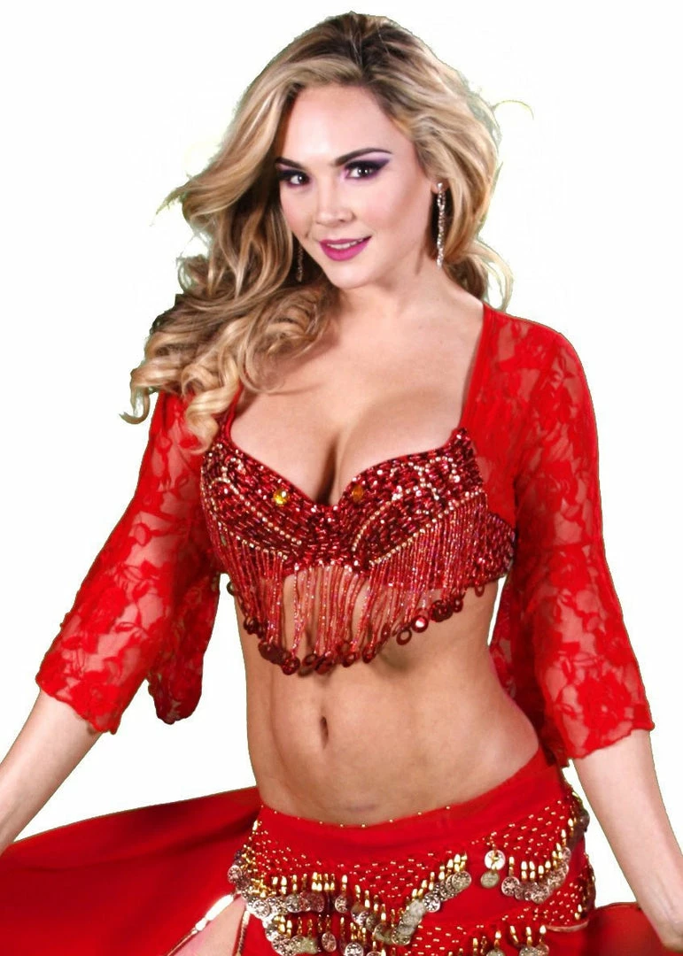 TBR3- Noche Top…This top is apart of our Pera Tribes series, its a sturdy bra top with laced bell sleeves. Fringe and heavy decor make top versatile for the many genres of Tribal belly dance that have come to be. Pair this with lace harem pants, sheer pantaloons, skirts, and jewelry for a complete look.
