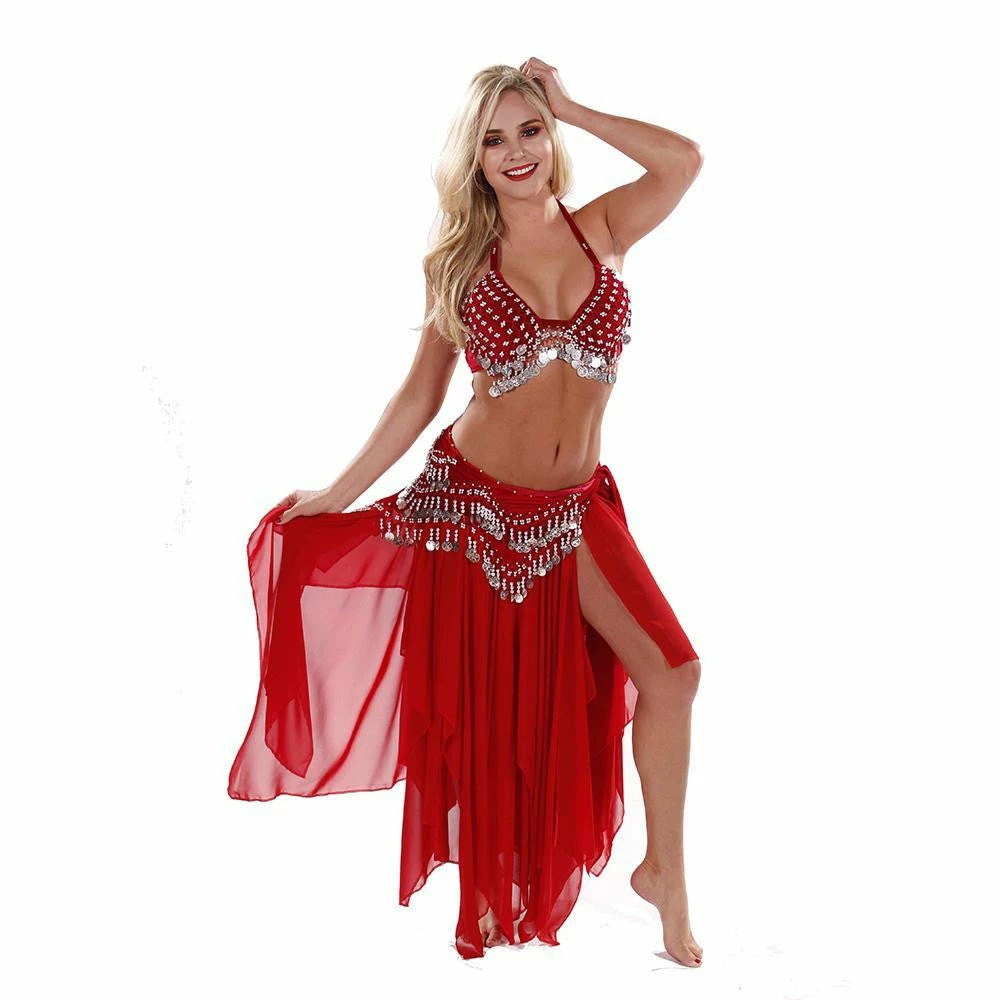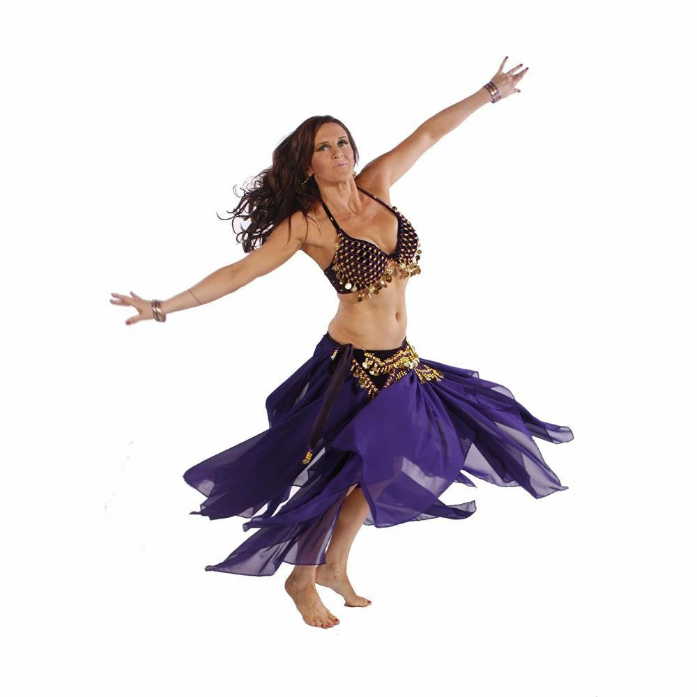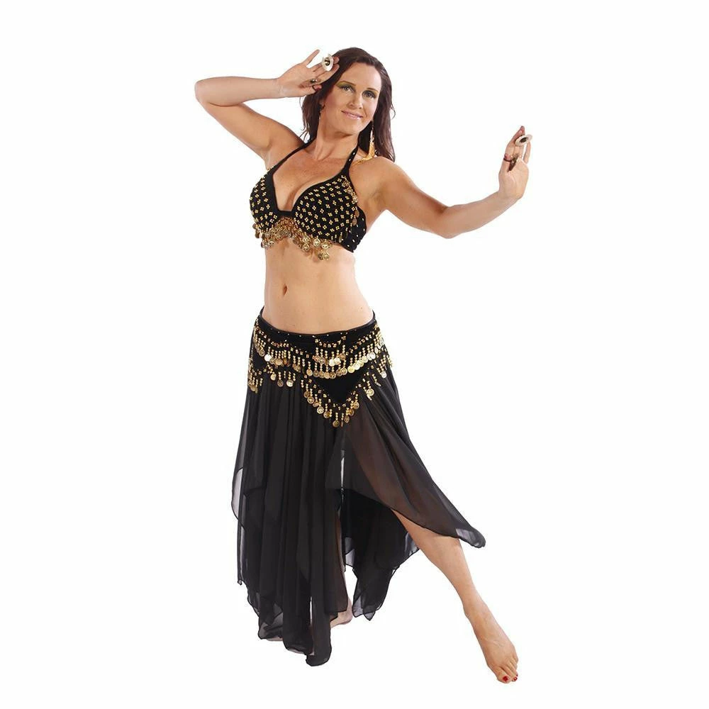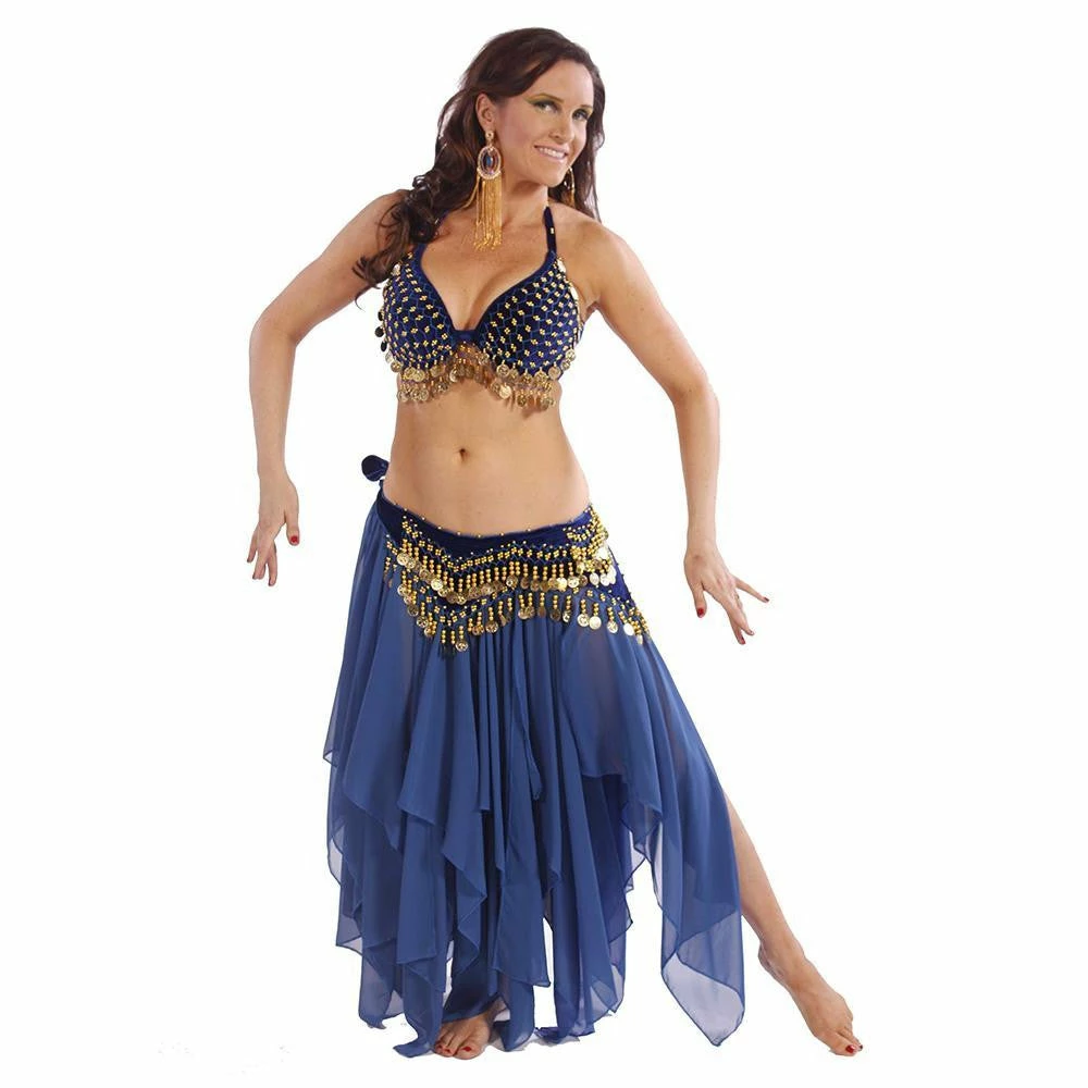 CS235 Tribal Tribute…We remember the early days of Tribal belly dance and the mix of fabrics and earth tones. Here’s a tribute to that time period. This 3-piece costume allows room for creativity through accessories. Perfect for troupes or solo performances. Please note, the under-bust is large to accommodate different sizes, but the top can be easily altered by moving the hooks on both sides of the bra to fit your desired measurements.