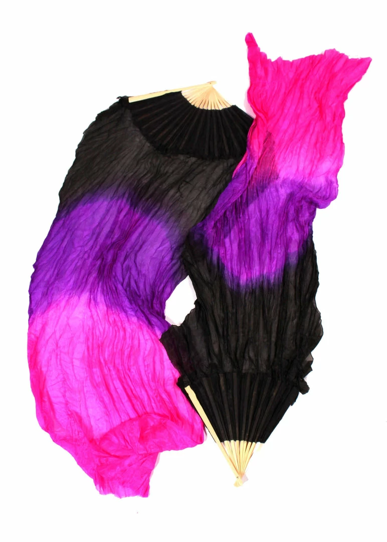 FAN6- Poissi Koi Fan…BLACK/PURPLE/FUSCHIA This veil fan flutters and tumbles about like ribbons. The vibrant colors channel a number of great energies such as power and engagement. Enjoy these in a gorgeous troupe number or for your next spectacular solo show.  Comes in a set of 2, one for each hand