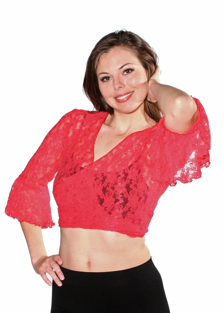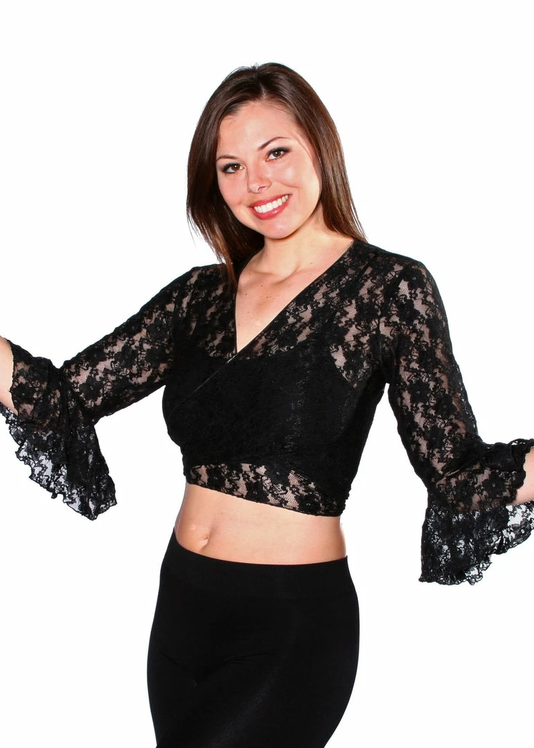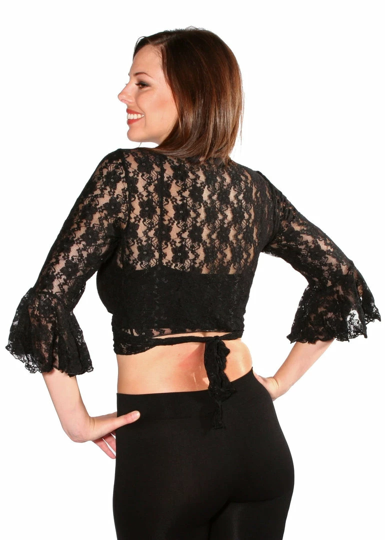 TP21-Bellene…Our lace top with short bell sleeves is a cross genre belly dance raqs wear item. This works with Gothic belly dance, fusion, flamenco and much more. Top comes in three colors, crosses the chest and ties in the back.