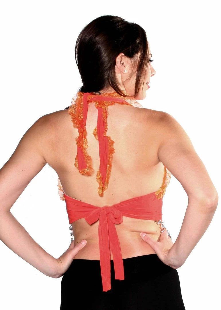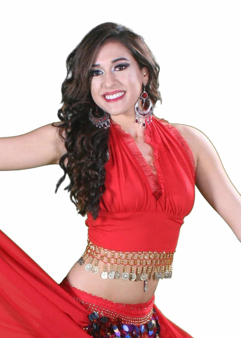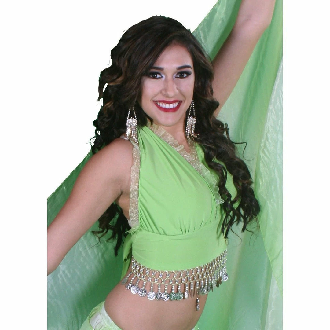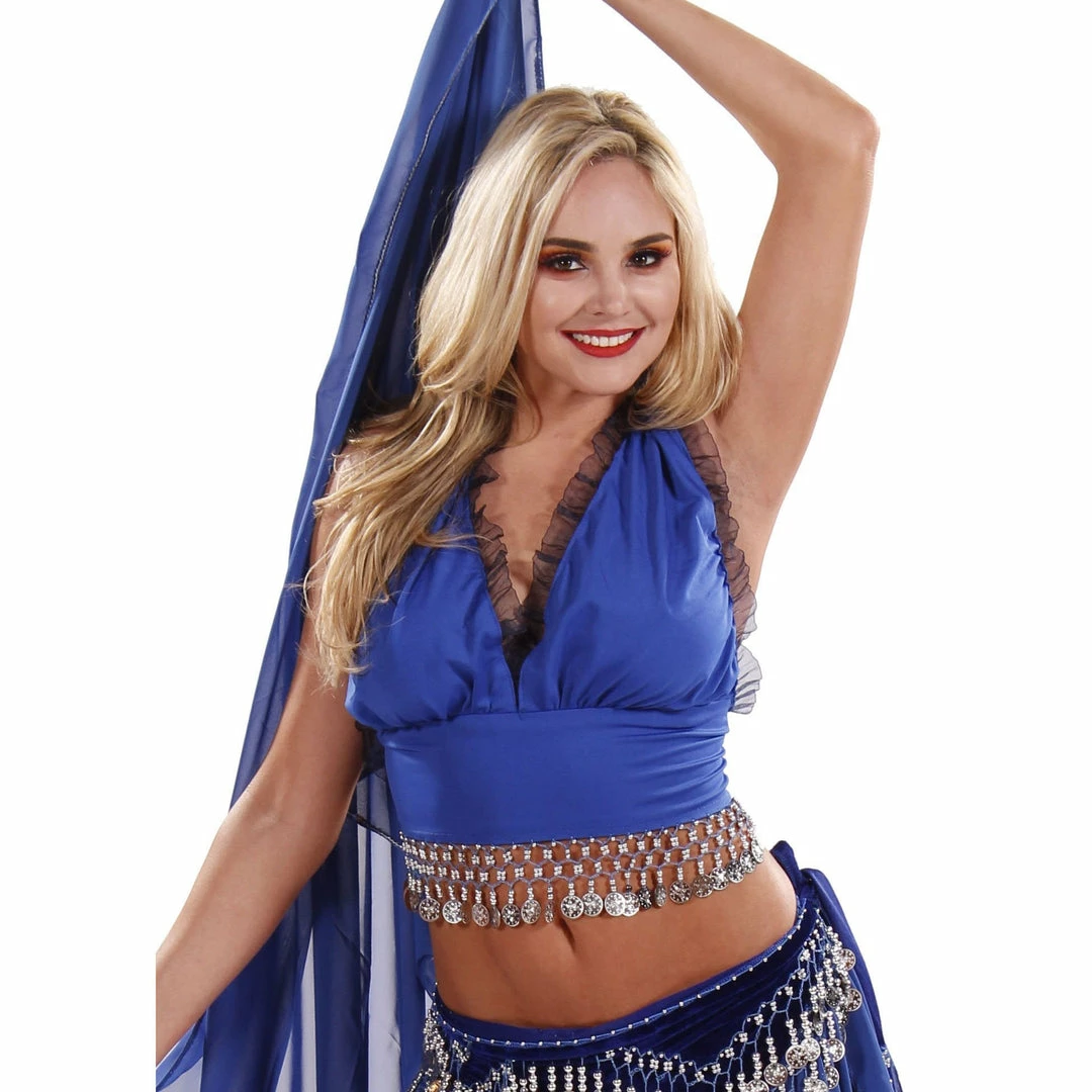 TP03 – Masriya Monroe…A stylish halter top with ruffled chiffon lace along the sides. The top has a tummy flattering bodice complete with coins and ties in the back. Pair this will a full circle skirt and belt or wear it with jeans or embroidered pants. Perfect for a breezy summer night or to be draped with a shawl during those crisp cool months. Check out the many colors!