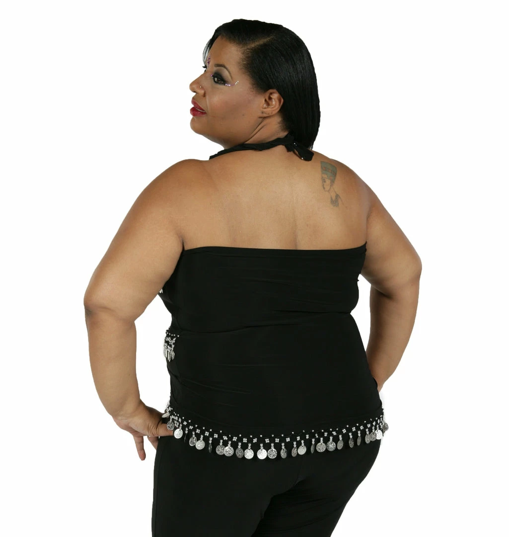 TP02– Karsilama…This very cute coin top is flirty, fun and fancy. The top is made of a stretchy material and ties in the front, you also have the option to leave the top down. This top is tied at the neck, allowing this to fit all neck sizes. Multiple coins and beads give this a unique look. Enjoy this with a number of our skirts, harem pants or pair it with that perfect piece in your own closet. Everyone will want to dance with you when wearing it!
